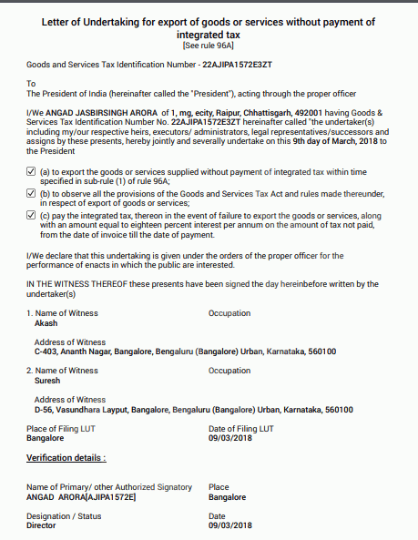 - LUT cover letter - request for acceptance - duly signed by an authorized person